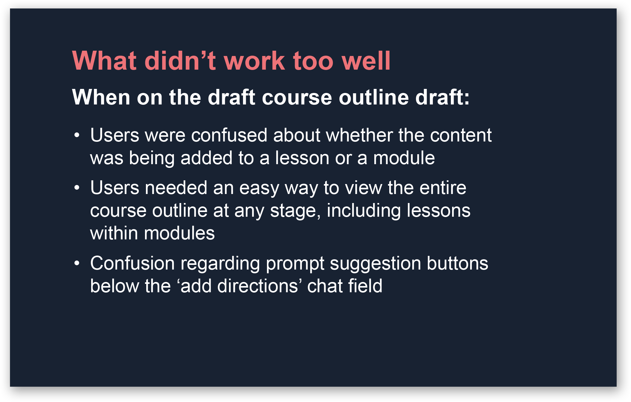 Research and journey mapping revealed that defining the course structure was one of the most overwhelming stages of the creation process. To reduce this friction, I integrated a chat-based AI into the course outline flow, supporting course creators of all experience levels through a familiar, low-effort interaction model that captures key inputs. Designers can then continuously refine the outline using chat-style prompts alongside a text editing tool.