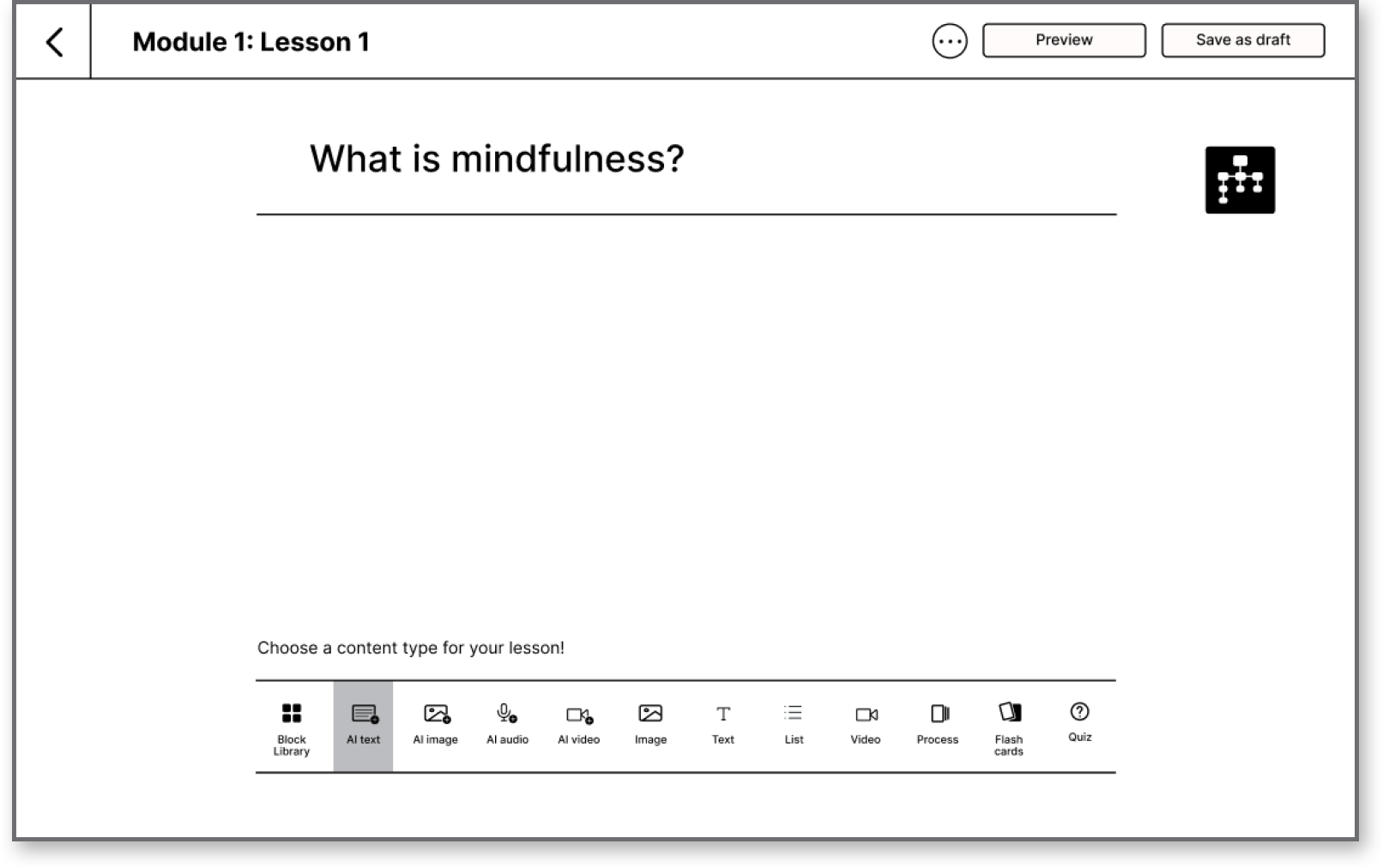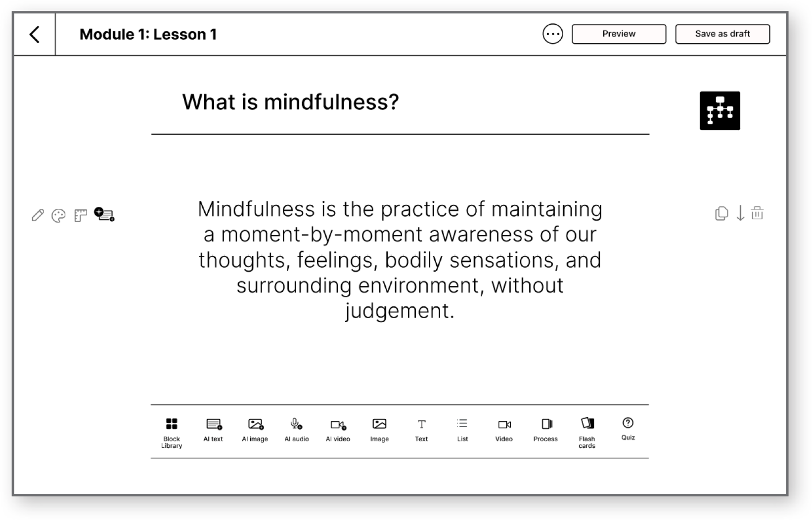 Lesson content is built in blocks, with AI outputs shaped by inputs from the outline stage, including audience and accessibility needs. Clear, icon-based navigation and a clean interface reduce cognitive load and support faster decisions. AI-assisted creation adapts to different experience levels, helping users move from idea to structured content efficiently and with confidence.