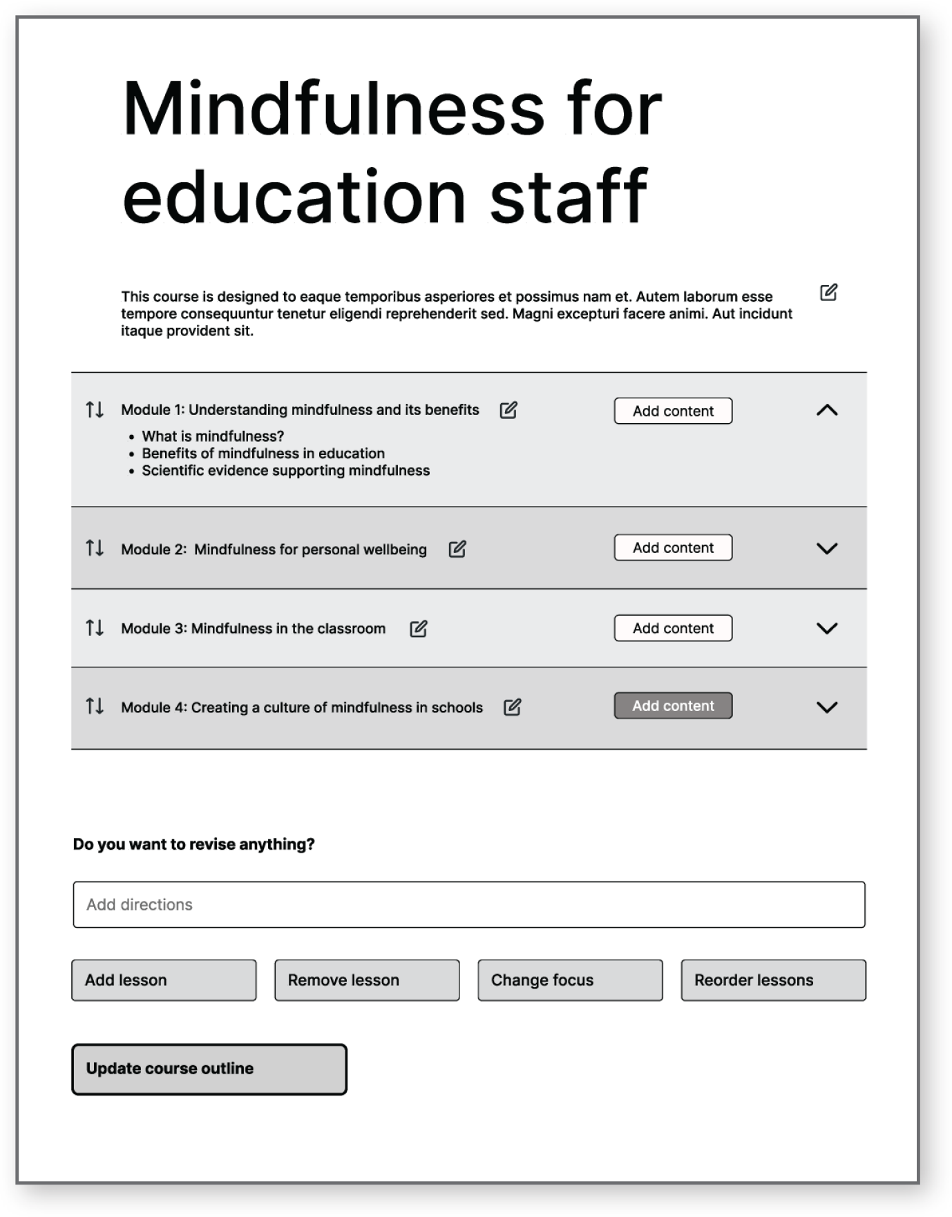 When the course outline is developed first and clearly articulated, it provides a structured framework that enables learning designers to confidently build and populate lesson content.