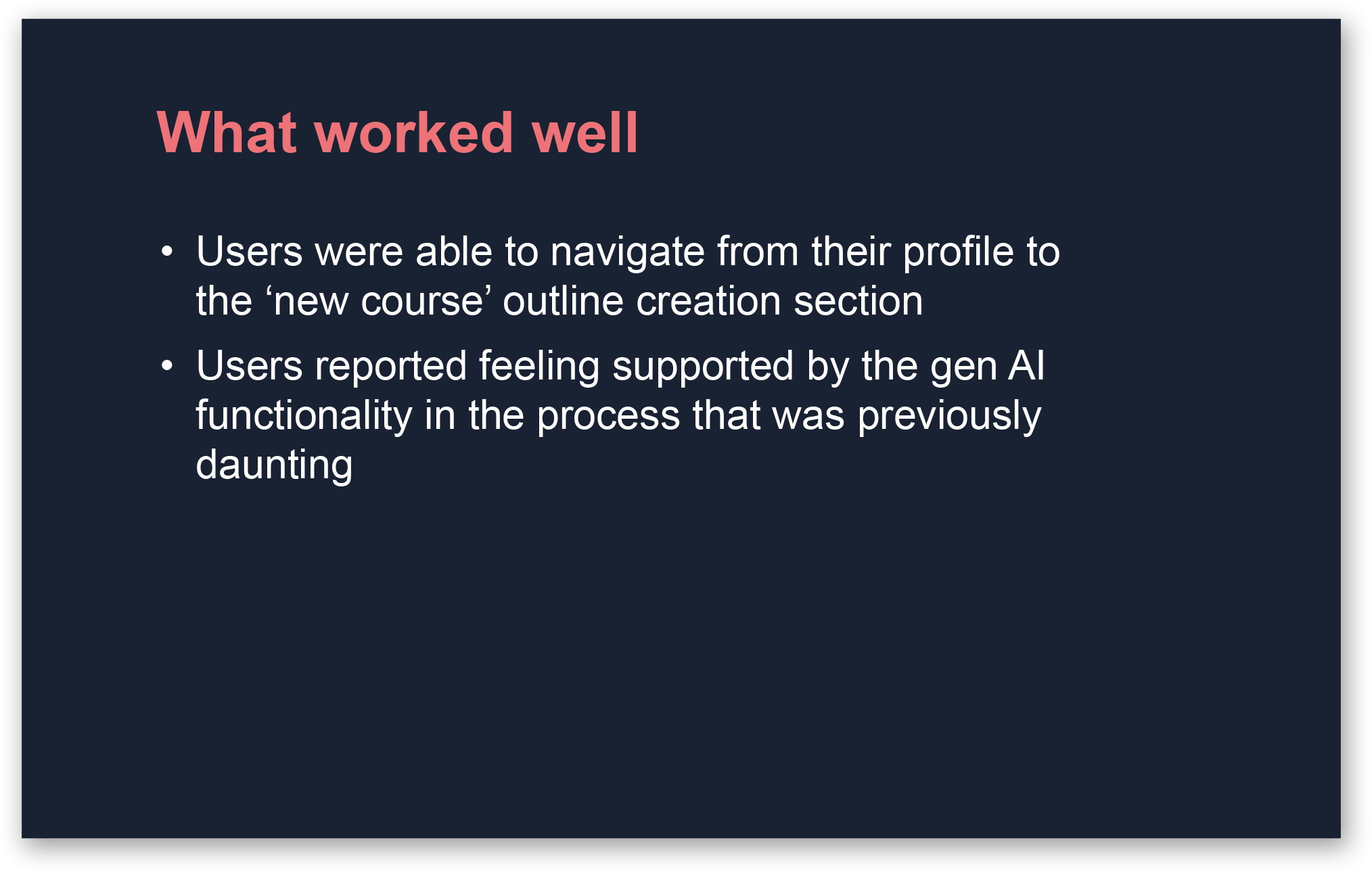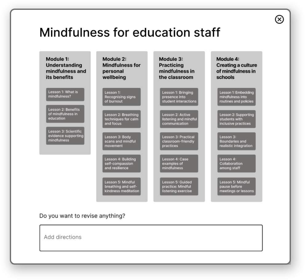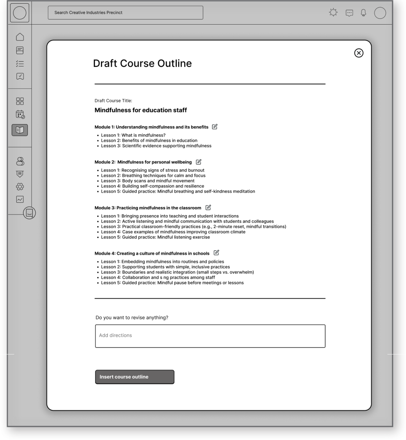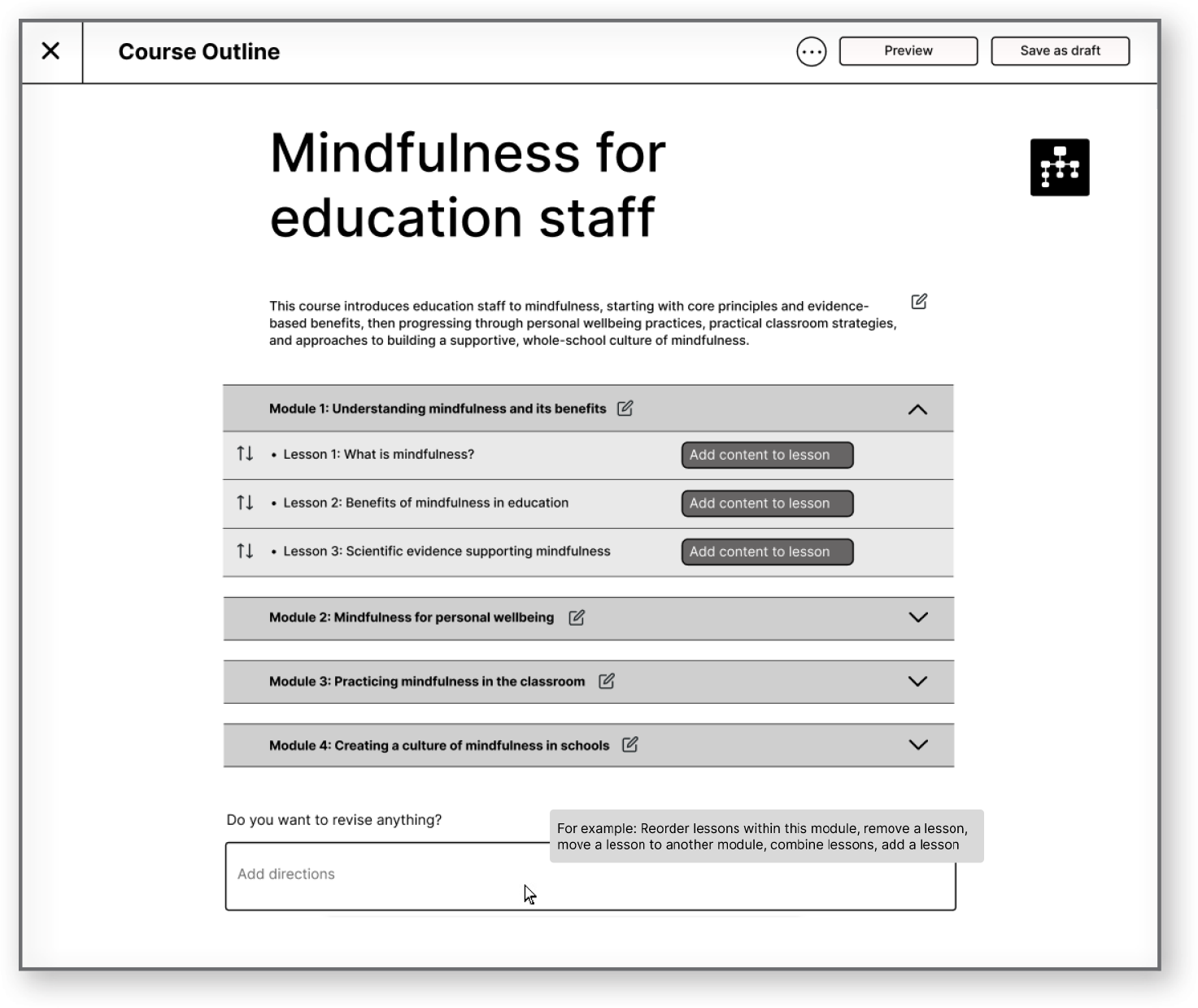 A concept the client can confidently take forward. The proposed AI-assisted workflow reduces complexity while maintaining user control through familiar, low-friction interactions, supporting designers of all experience levels from outline generation through to lesson content.