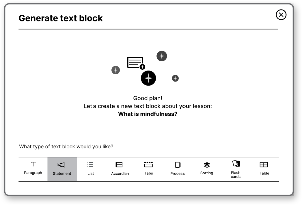 By integrating generative AI options into the lesson content creation process, course creators of varying experience levels can choose their level of content creation support, empowering novice learning designers to feel like experts quickly and easily.