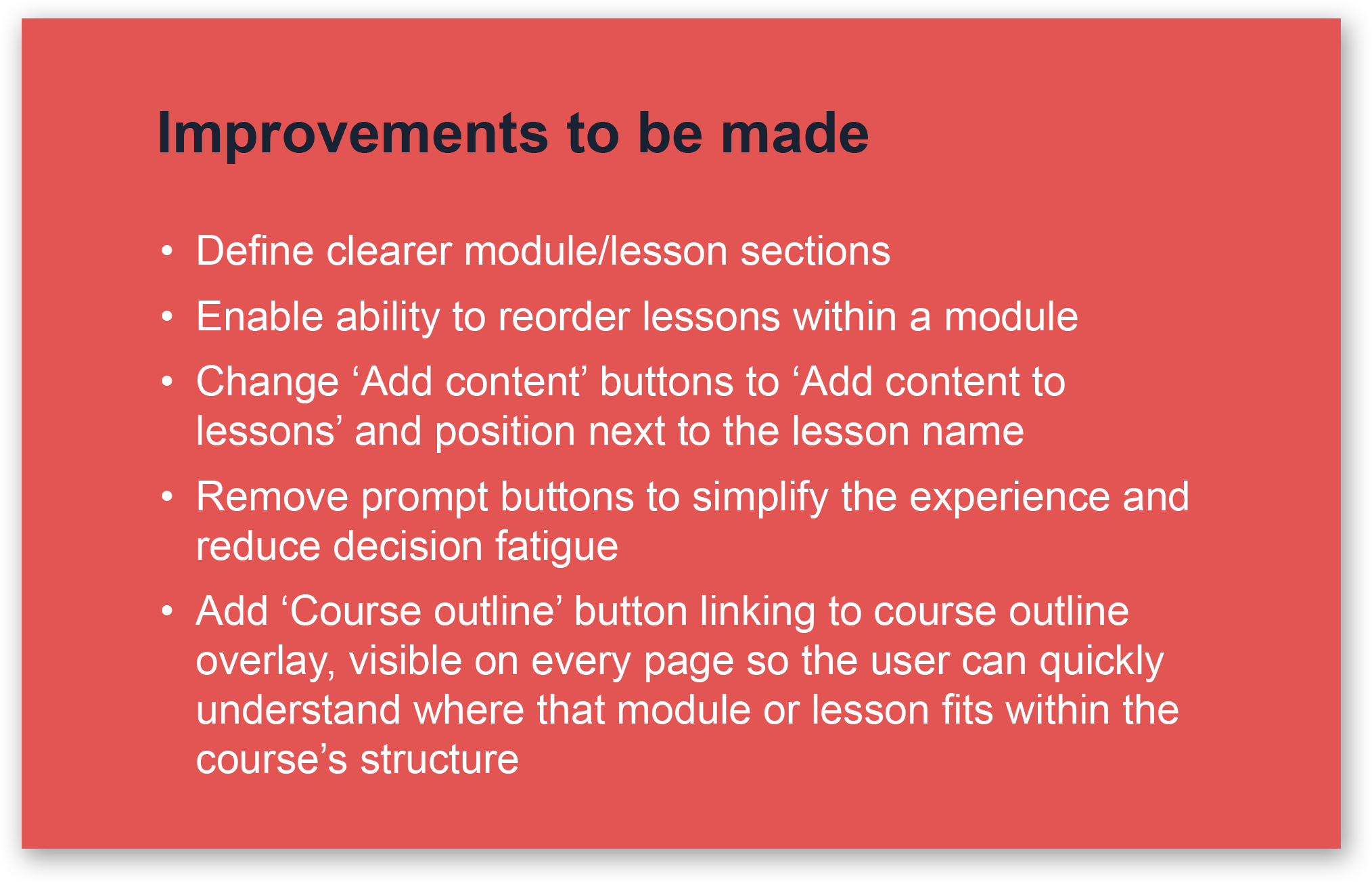 After walking through the prototype with various users who had no course creation experience, it became clear that while there were no major stumbling blocks, there was still room for refinement.